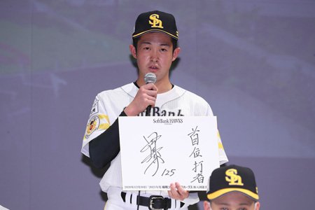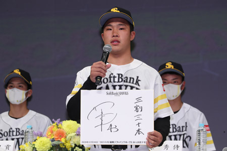 高校通算50本塁打を誇る右のスラッガー内野手は「3割30本塁打をコンスタントに打って、息の長い選手になりたい」と抱負を口にしました。「まずは年間を通して戦える体づくりから励みたい」としながらも、「ソフトバンクの戦力になりたい」ときっぱり。背番号43については「この前まで江川(智晃)さんがつけていた背番号。それに恥じない活躍をしたいです。将来はチームの主軸になってチームの先頭に立って引っ張っていきたい」と力強く話しました。