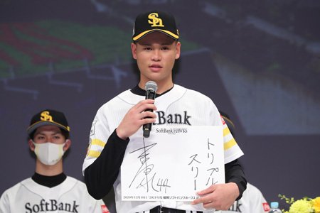 身長193センチの超大型野手で、握力(右82、左80)と背筋力300キロと桁違いのパワーを誇る左打者です。それでいてスピードにも自信があり「トリプルスリー」を目標に挙げました。そして、背番号44といえば、柳田悠岐選手が新人時代から4年間つけた番号です。「高校時代に柳田2世と呼ばれたこともあります。そうなりたいです」と話しました。ただ、工藤公康監督からは「笹川1世を目指してほしい」という言葉も。自らの力で球史に名を刻む大選手を目指します。