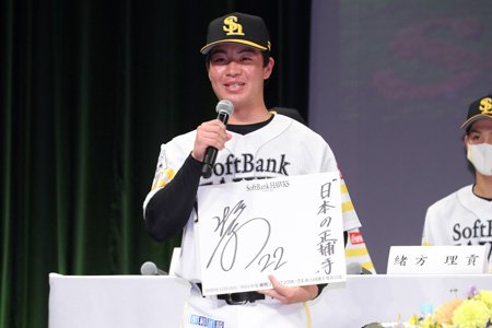 バットコントロールが秀でた「打てる捕手」として期待も大きな選手です。「日本の正捕手」が夢。会見では「すごく緊張している」と言いながらも、ユニフォームの感想を問われて「すごくスースーして着やすいです」と珍回答で会場を沸かせました。さらに「ホークスの連覇に貢献できるよう、甲斐選手を抜いて頑張りたい」と言い切ると、頼もしい言葉に会場で見守ったファンから「おー」という声が漏れました。