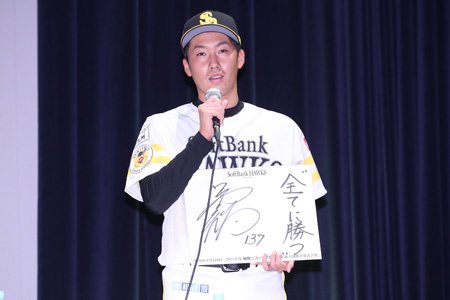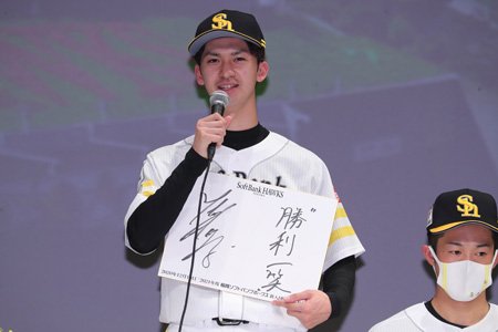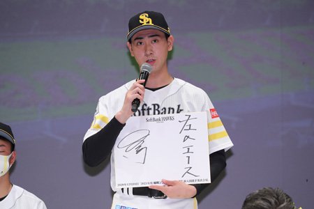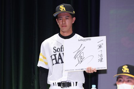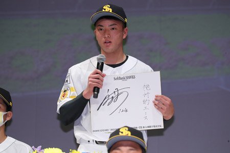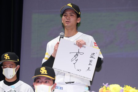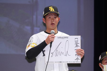熊本出身の九州男児は「小さなころからホークスファンだったので、そのユニフォームに袖を通せるのが嬉しい」と感激の様子。「目標は、チームから頼られる投手。千賀投手を目標に頑張りたい」と話しました。