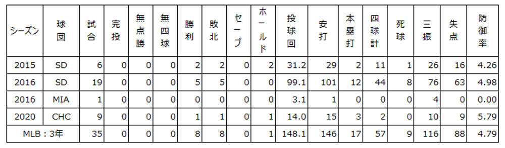 | 球歴 | San Diego Padres (2015–2016) Miami Marlins (2016) Chicago Cubs (2020) |
