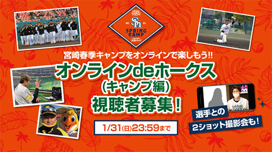2月1日(月)よりスタートする「宮崎春季キャンプ2021 Supported by スカパー!」(以下、宮崎キャンプ)では、キャンプ中の選手練習風景のLive映像を中心に、ハリーチャレンジやハニーズによるキャンプ地レポートなどを配信する「オンラインdeホークス(キャンプ編)」を5日間限定で開催!観覧者をクラブホークス会員・タカポイント会員から募集します。