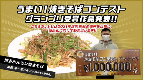 もしも自分の焼きそばレシピがPayPayドームでメニューとして提供されたら…?ホークスファンの夢がいっぱいに詰まった「うまい!焼きそばコンテスト」が2021年1月開催されました。総応募数約300件のレシピの中から、書類審査・実食審査を経て、見事グランプリに輝いたのは、福岡市の〇八ホルモン博多店 尾関さん考案の「博多ホルモン焼きそば」!グランプリを受賞した尾関さんには賞金100万円が贈られ、グランプリ受賞レシピは2021年度開幕戦の発売を目標に、商品化に向けて動き出します♪受賞レシピの発売詳細は後日お知らせしますのでこうご期待ください♪