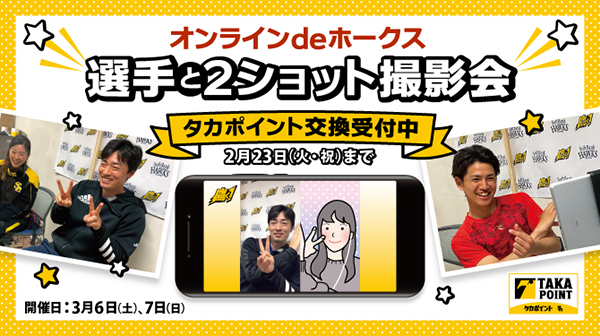 タカポイントでは、3月6日(土)・7日(日)の2日間、宮崎春季キャンプでも大変好評の「オンラインdeホークス 選手と2ショット撮影会」の参加者をクラブホークス会員・タカポイント会員から抽選で募集します!ライブトークアプリ「Meet Pass(ミートパス)」を使用して、15秒間選手と2ショット撮影できるんです♪出演選手は当日のお楽しみ!ポイント交換での抽選受付となりますので、お見逃しなく!