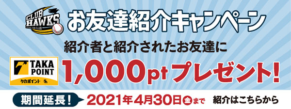 2021年4月30日(金)までに、WEBでクラブホークスにお友達をご紹介いただいた方、紹介で新規入会いただいたお友達どちらにも、「タカポイント1,000pt」をプレゼント♪