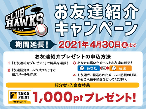 公式ファンクラブ クラブホークスのWEBお友達紹介キャンペーン第2弾の期間を延長いたします。