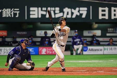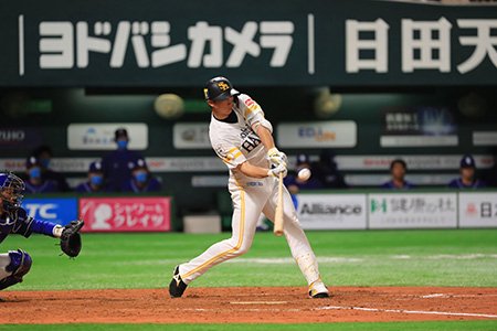 八回には途中出場の真砂勇介選手も一発だ。ライトの「福岡トヨタ ホームランテラス」に打球が吸い込まれていった。「打ったのはアウトコース低めの真っ直ぐ。追い込まれていましたが、逆方向に意識をして、くらいついていきました。2ストライク後のバッティングでは粘り強く、と心掛けている。結果的に本塁打という最高の形になりました。外野手争いが熾烈なのでそこに割って入れるように結果を出していきたい」とアピールに必死だ。
