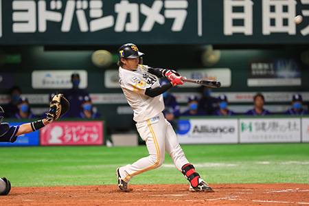 3本のアーチが飛び出した。まずは二回2アウト二塁で7番・上林誠知選手がライトスタンドへ大きな一発を放った。これまでは比較的苦手にしていた内角高めの直球をとらえて、技ありで運んだ。「軸足が遠回りせずに、しっかり体の内側の力を使えて打てたからファウルにならなかったと思います」。上林選手はキャンプ中の紅白戦の初戦から実戦10試合連続安打とずっと好調モードだ。