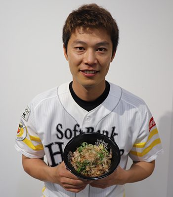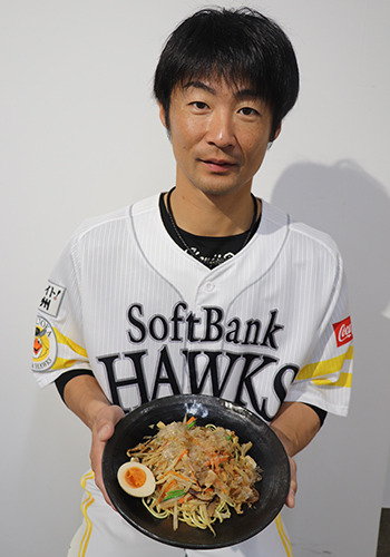 国産牛ホルモンを使い食べ応えがあり、オリジナルのソースをベースに吟醸醤油で香ばしく仕上げたPayPayドームでしか食べることのできない味わいです。岩嵜投手もおすすめです♪ぜひ球場で生ビールと一緒にお召し上がりください!
