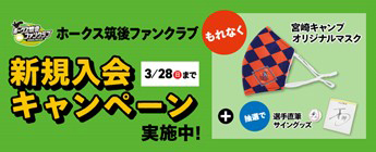 3月28日(日)までにホークス筑後ファンクラブに新規入会いただいた方全員に、キャンペーン特典として宮崎キャンプオリジナルマスク1枚をプレゼントします。