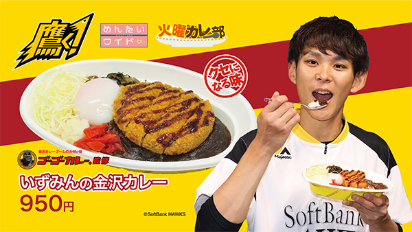 FBS「めんたいワイド」の人気コーナー“火曜カレー部”とタッグを組み、泉投手初のグルメメニューが誕生!その名も「いずみんの金沢カレー」!泉投手の出身地である石川県で長く愛され続けている金沢のゴーゴーカレーをベースに、火曜カレー部がおすすめのトッピングをチョイス。さらにその中から泉投手がお気に入りのトッピングを選んで完成した、福岡PayPayドームでしか食べることのできないメニューです。3月26日(金)よりコンコース内5ゲートスタ飯ラボ5にて販売♪