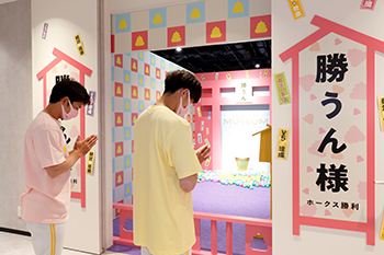 昨季大活躍した周東選手と栗原選手。3月26日(金)からの開幕戦に向け、更なる活躍を祈願しに「勝うん様」にお参りにやってきました。6階に辿り着いた栗原選手は指示を待たずにグッズショップを覗き見して「おー、すごい!」とワクワクを隠せない様子。しかしお参りするときは真剣です。「今年はチームはV5目指して、個人でも更に飛躍できるよう頑張ります」と今シーズンの意気込みを語ってくれました。
