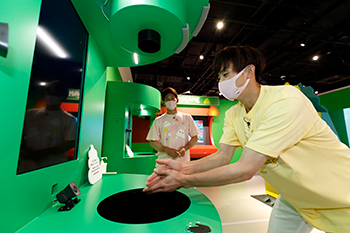 お参りの後にうんこミュージアム内を体験しました。ホークスコラボのTシャツとマスクもお似合いです。「こんにちうんこ~」と突然現れたお姉さんに戸惑いを隠せない二人。そして、うんこへの固定概念を水に流すためうんこミュージアムの合言葉「うんこ!」を叫ぶよう指示が…。「小学生ぶりに叫ぶワードだ…」と恥じらう周東選手に対し、「うんこぉぉぉぉ!」と拳をあげて叫ぶ栗原選手はその後の「MY UNKO MAKER」でも踏ん張る姿が様になっていました。インスタ映えならぬウンスタ映えなスポット「ウンスタジェニックエリア」では写真撮影だけでなく、お互いがカメラマンになって撮影し合ってもらいました。栗原カメラマン・周東カメラマンによる写真もご覧ください。そして、一際盛り上がったのがクソゲーセンター内「うんこ白刃取り」。上から落ちてくるうんこをキャッチする反射神経が問われるゲームなのですが、なんと昨年度パ・リーグ盗塁王の周東選手は3回挑戦し、一度も手が出ず…!目だけでうんこを追ってしまう姿に、思わず栗原選手も関係者も大爆笑でした。