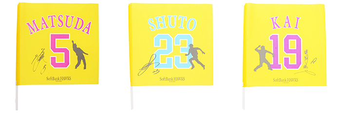 どの選手が出るかお楽しみ!応援グッズの新定番、全20種の応援フラッグです。このフラッグを掲げて、HAWKSを応援しよう♪