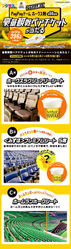 日晴金属が実施する、対象商品『ホークスコラボのフクラスくん(4個入り)』、もしくは『フクラスくんお試しセット』をご購入いただいた方の中から抽選で①A賞:ホークスラグジュアリーシート②B賞:<みずほ>プレミアムシートS席、③C賞:ホームランホークシート、いずれかの豪華観戦ペアチケットが毎月当たるキャンペーン、第3弾が始まります!!