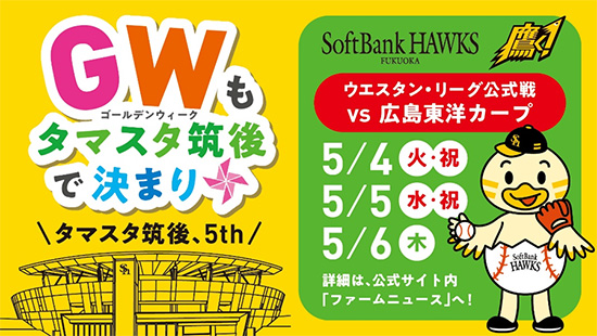 いつも若鷹へのご声援をいただき誠に有難うございます。5月4日(火・祝)~5月16日(日)にタマホーム スタジアム筑後で開催される、ホークス主催ウエスタン・リーグ公式戦全6試合のチケットを4月13日(火)より順次発売します!