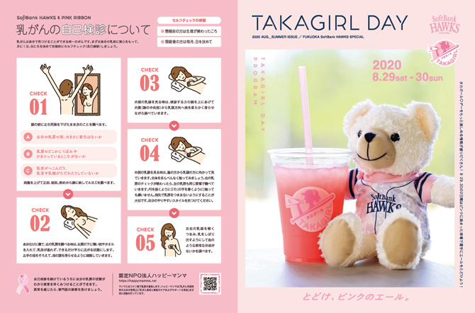 「ピンクリボン運動」を行っている認定NPO法人ハッピーマンマとコラボレーションし、ホークスファン、野球ファンの女性へ向けたメッセージとして、乳がん検診や球場内の「ピンクリボン」デザイン化などを行います。