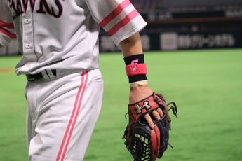 ●「ピンクリボンユニフォーム」「ピンクリボンキャップ」「ピンクリボンヘルメット」を選手が着用