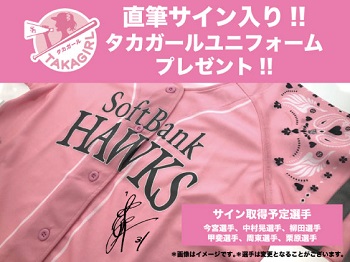 選手が選べる!HAWKS STOREまたはHAWKS公式オンライストアで、税込1万円以上の商品ご購入いただいたお客様の中から抽選で12名様に、「直筆サイン入りタカガールユニフォーム」が当たるキャンペーンを実施します!