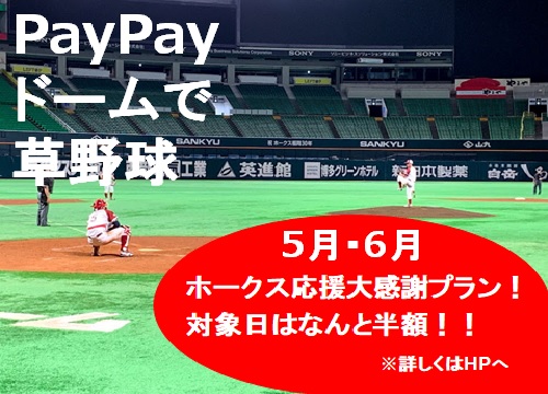 2021年5月・6月の草野球として利用可能な日程への募集を開始します!今回はホークスを応援いただいている皆様に感謝を込めて、なんと半額でご利用いただける「ホークス応援大感謝プラン」をご用意しました!また草野球御利用の方全員にBOSSE・ZOFUKUOKA特別クーポンをプレゼント♪オプションで最新鋭の映像設備もご利用可能です。ドームなので天候や気温を気にせずに日程が組めるので安心!ぜひこの機会をお見逃しなく♪