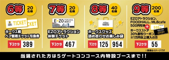 ※1~9等当選者は、試合終了30分後までに5ゲートコンコース内 特設ブースへお越しください。時間を過ぎた場合、当選が無効となります。