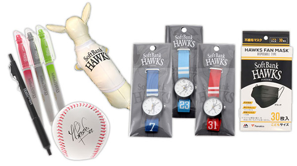観戦のお供や普段使いにも♪新商品のグッズをご紹介!文字盤には選手のプレー写真のシルエット、バンドには背番号がデザインされた人気の腕時計シリーズに、柳田選手の新色と3選手が新登場!学校やオフィスで活躍する文房具も続々ラインナップ中です!さらに、ホークスロゴのはいったキッズサイズの不織布マスクや、ペット用のユニフォーム等の新商品もお見逃しなく!