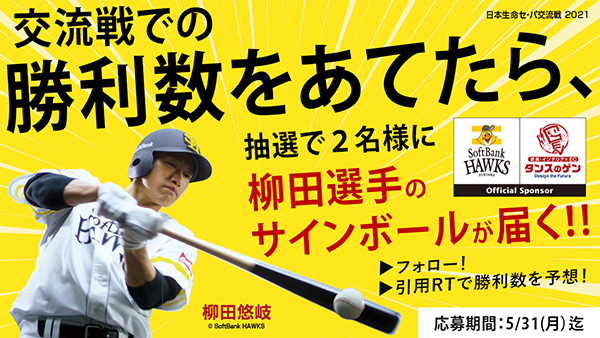 タンスのゲンの公式Twitter @tansu_no_genにて、交流戦でのホークスの勝利数を予想すると、当選者の中から2名様に柳田選手のサインボールがもらえるキャンペーンを開催します。交流戦全18試合のうち、ホークスの勝利数を予想するこのキャンペーン、5月31日(月)まで応募受付しています。是非、チェックしてください!