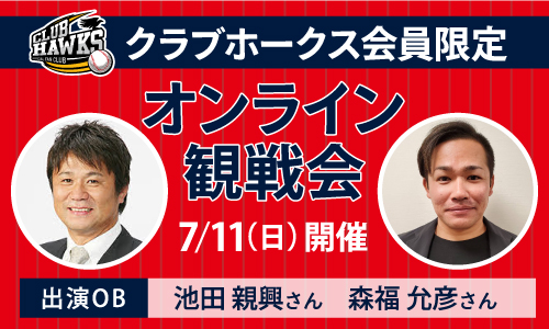 公式ファンクラブ クラブホークスでは、7月11日(日)のオリックス・バファローズ戦にて、ホークスOBとの野球観戦をおうちで楽しめる「クラブホークスオンライン観戦会」を開催!ゲストとして池田親興さん、森福允彦さんが登場!投手目線での解説やOBだからこそ話せるトークなど、ここでしか体験できない特別な試合観戦ができるイベントです!タカポイント交換にて先着順で受付いたします。奮ってご応募ください!