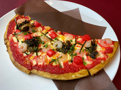 | 明太子、もち、高菜などをトッピングしたピリ辛具合が食欲をそそるオススメのレッドピザ。 | |