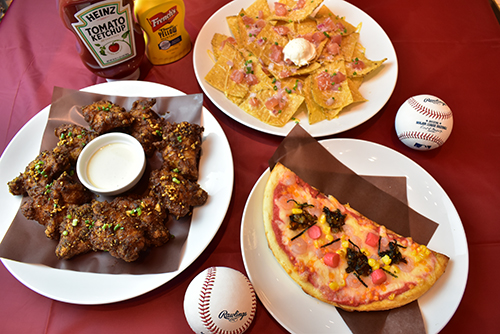 | 鷹の祭典2021限定メニュー「ピリ辛もちめんたいピザ」とMLB café FUKUOKAの人気メニュー「チキンドラムスティックアナハイム風」・「セントルイス風フォーハンズナチョス」が楽しめる鷹の祭典2021限定のお得なセットメニュー。 | |