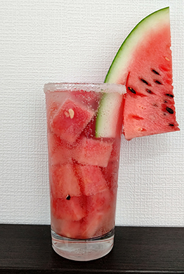 | 凍らせたスイカの果肉をたっぷり使ったスイカチューハイ。グラスに付いた塩がスイカの甘さをひきたてます。 | |