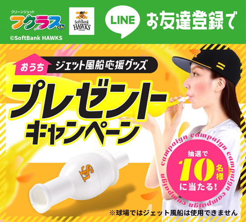 フクラスくんLINE公式アカウントをお友達登録いただいた方の中から抽選で、ウイルスカットでクリーン&らくらく簡単に風船が膨らませられる、ホークスコラボのフクラスくん2個入りが10名様に当たるキャンペーンを実施いたします!