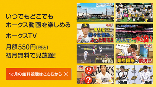 サブスクリプション型のホークス公式動画サービスです。月額550円(税込)でいつでもどこでもここだけのホークス映像が見放題!詳しくはこちら