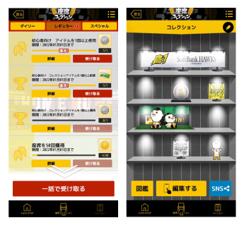 ミッションをクリアしていくことでタカポイントが獲得できるほか、アプリ内のアイテムをコレクションしていくことができます。ミッションは簡単なものから1席単位のハードなものまでさまざまなミッションをご用意!毎日おうちで、そしてPayPayドームでホークスを応援して、ミッションコンプリートを目指しましょう!