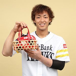 大分県は、「別府竹細工」とのコラボで“大分出身”今宮健太選手による「HAWKS×別府竹細工 今宮選手プロデュースカゴバッグ・小」です。大分の伝統工芸品である竹細工を身近に感じられる普段使いしやすいカゴバッグ。内側の巾着は、大分県の県花である豊後梅をイメージした花柄に今宮選手のプレーシーンのシルエットを入れ、竹かごバッグに合う和テイストに仕上げています。「小学校の時に竹細工を作る体験をしたことがあり、楽しかったのを覚えています。最高にかわいいと思うので、皆さんにはファッションの一つとして大事に使って欲しいです。赤が好きなので、この色にしました。自身が育った地元の工芸品なの で、一人でも多くの方に手に取ってもらいたいです」と笑顔交じりでコメントしました。