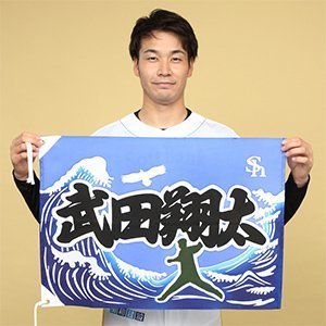 宮崎県は、「大漁旗」とのコラボでやはり地元出身の武田翔太投手が手掛けました。「HAWKS×大漁旗 武田投手プロデュース旗」です。延岡市の漁師町・北浦の伝統文化として残る工芸品の大漁旗です。大漁旗らしい波をメインに、武田選手のシルエットと名前を力強くデザインしています。現在「吉田旗店」1 軒だけが、今もなお昔ながらの技法で絵・色付けを行っており、職人さんが1つ1つ手作業で製作した味のある作品です。「迫力があって、渋い感じが出ていてカッコいい。手作業もすごい。自分のロッカーに飾って、頑張りたいと思います。迫力がある良い旗を作ってもらったので、沢山の人に手に取ってもらって、みんなで掲げて応援してほしいです」とリクエストしていました。