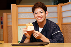 DAIMYO SOFTCREAM MARK IS福岡ももち店の看板商品でもあるモンブランソフトに攻・走・守の揃った栗原選手をイメージして盛り沢山のスイーツを詰め込んだ商品です。