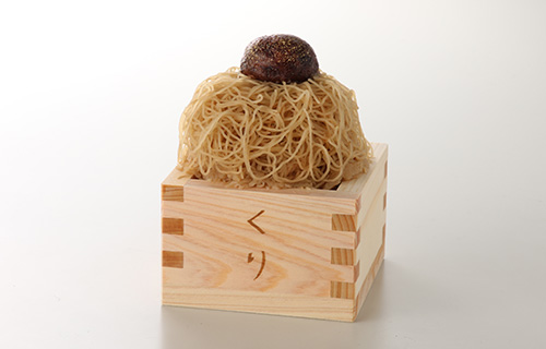 土台となるスポンジには『台湾カステラ』、濃厚ミルクのソフトクリーム、福井県の名菓『羽二重餅』。さらに金粉がけ栗の渋皮煮を乗せました。