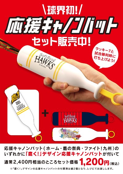 | セット内容 | 応援キャノンバット2本 ※ホーム、鷹の祭典、ファイト!九州のいずれかに「鷹く!」デザインの応援キャノンバットがセットになります。 |