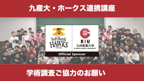 九州産業大学にて、連携講座の一環としてホークスファンの皆さまを対象とした「スタジアムグルメとキャッシュレス決済に関する調査」を実施します。本調査は下記URLからお答え頂くインターネット調査(アンケート表)と、任意の方にご協力頂くインタビュー調査(Zoom等を用いて遠隔にて実施)の2つによって構成されています。ご協力のほどよろしくお願い致します。