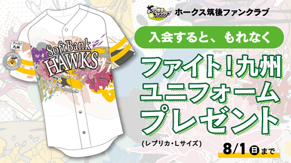 8月1日(日)までにホークス筑後ファンクラブに新規入会いただくと、通常特典に加え、もれなく「ファイト!九州ユニフォーム(レプリカ)」をプレゼントします。