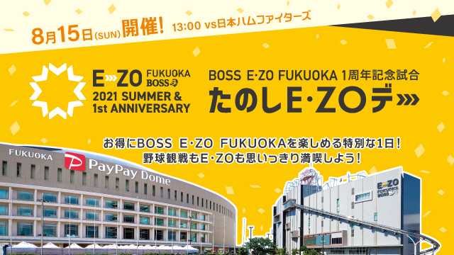 PayPayドーム横のエンタメ施設「BOSS E・ZO FUKUOKA」は開業1周年!日頃の皆さまからのご愛顧に感謝し、8月15日(日)北海道日本ハムファイターズ戦にて、BOSS E・ZO FUKUOKA1周年記念試合「たのしE・ZO(イーゾ)デー」を開催します!入場者全員にE・ZOで使える特典チケットをプレゼント♪さらにE・ZOをご利用された方には、当日限定で選手グッズ(非売品)を配布するなど、お得な特典が盛りだくさん♪試合観戦もE・ZOも思いっきり満喫しよう!