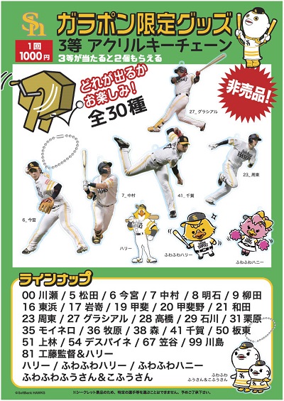 7月30日(金)・31日(土)東京ヤクルトスワローズ戦、8月3日(火)~8月5日(木)読売ジャイアンツ戦のエキシビジョンマッチ期間中、5ゲート外グッズ特設テント・4ゲート場内グッズワゴンで福岡限定グッズをそれぞれ販売いたします。また、空くじなしのガラポンでは人気シリーズ「アクリルキーチェーン】がパワーアップ!新しい選手のアイテムや新キャラクターも登場しています。