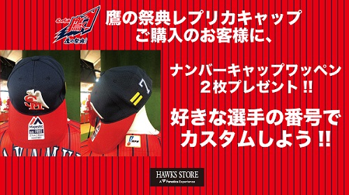 鷹の祭典レプリカキャップをご購入で、ナンバーキャップワッペンを2枚プレゼント!その場で圧着サービスも実施します。好きな選手の番号でカスタムしよう!