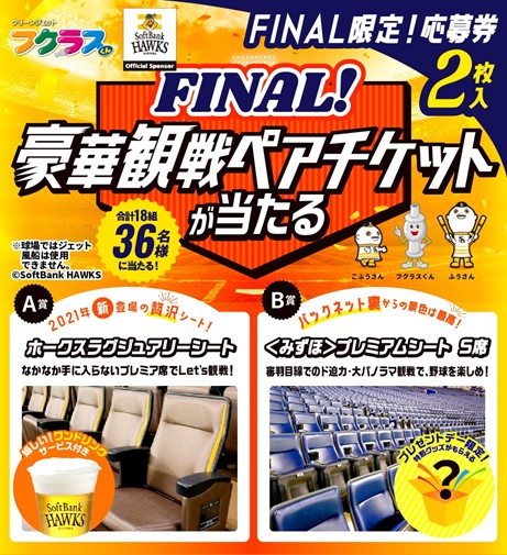 日晴金属が実施する、対象商品『ホークスコラボのフクラスくん(4個入り)』、もしくは『フクラスくんお試しセット』をご購入いただいた方の中から抽選で①A賞:ホークスラグジュアリーシート②B賞:<みずほ>プレミアムシートS席、③C賞:ホームランホークシート、いずれかの豪華観戦ペアチケットが毎月当たるキャンペーン、いよいよ最終応募期間が始まります!!