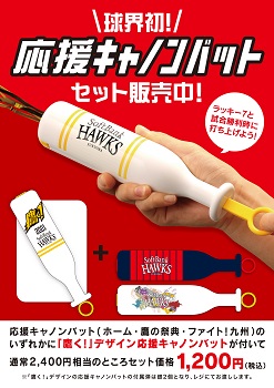 期間中、応援キャノンバット各種(ホーム・鷹の祭典・ファイト!九州デザイン)を1個と、「鷹く!」デザインの応援キャノンバット1個を合わせて2,400円相当のところセット価格1,200円で販売します!
