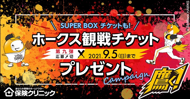 全国で約250店舗を展開する保険ショップ『保険クリニック』は、抽選で3組(最大30名)様に福岡会場プレミアム個室「スーパーボックス」での観戦チケットを、90組180名様にビジターの観戦チケットをプレゼント!