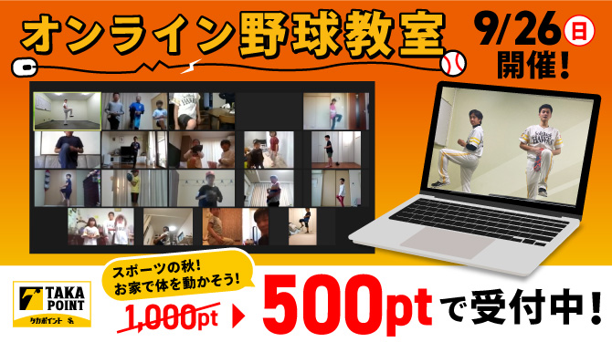 9月26日(日)に、ホークスOBの新垣渚さんと城所龍磨さんが講師を務める「オンライン野球教室」をタカポイント交換で先着順にて募集します。