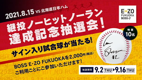BOSS E・ZO FUKUOKAでは、ホークスが8月15日(日)北海道日本ハム戦で達成した「継投による無安打無得点試合」を記念し、9月2日(木)〜9月16日(木)の期間中、抽選会を実施します!期間中、BOSS E・ZO FUKUOKAのアトラクションや飲食店を税込2,000円(合算可)ごとのご利用で、記録達成当日のサイン入り試合球やレプリカユニフォームなどが当たる抽選会へご参加いただけます。遊んで、食べて、嬉しいホークスグッズをGetしよう!