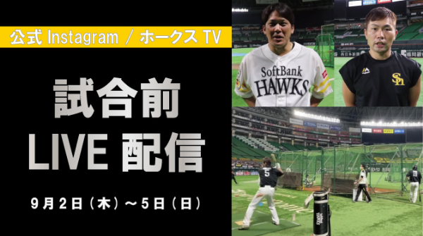 9月2日(木)はYouTubeとホークスTVのダブル配信を予定。3日(金)以降はホークスTVのみでお楽しみいただけます。
